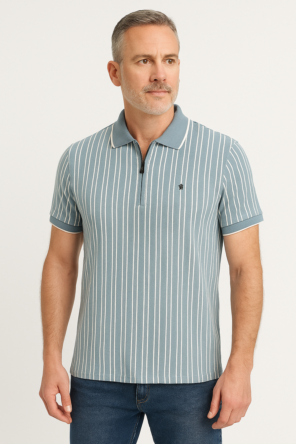 Step into effortless style with our Men's Blue Striped Polo T-Shirt. Featuring crisp white vertical pinstripes over a muted blue base, this polo offers a refined look that transitions perfectly from casual to smart-casual. The hidden zipper at the neck adds a modern, minimalist touch, while the soft, breathable fabric ensures unmatched comfort throughout the day. Finished with a subtle chest logo and tailored sleeves, this shirt is a must-have staple for every wardrobe.